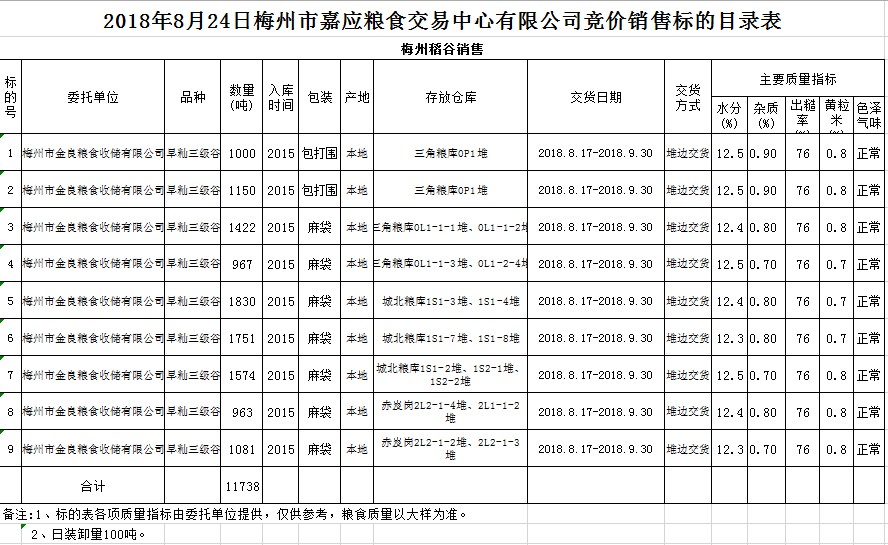 交易時間和地點:2018年8月24日(星期五)上午10時。廣東省梅州市彬芳大道南161號梅州市糧食交易中心3樓。