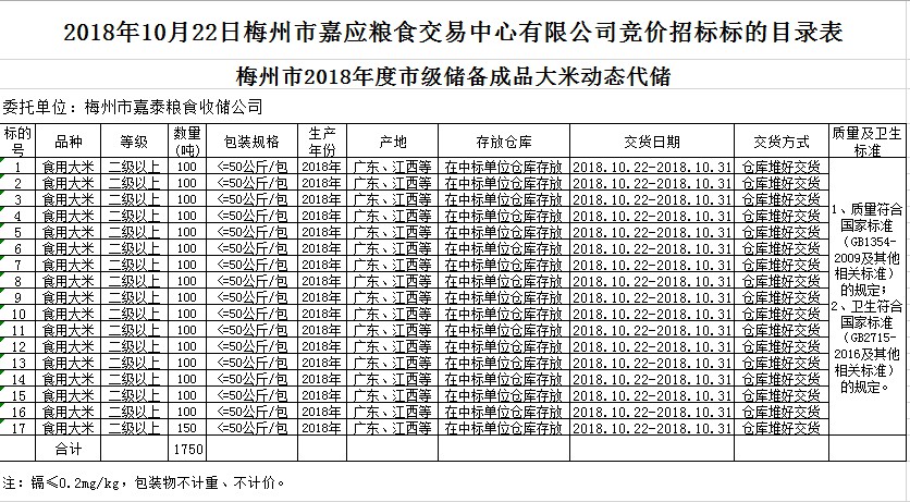 受客戶委托,梅州市嘉應(yīng)糧食交易中心有限公司定于2018年10月22日(星期一)上午10時(shí)在廣東省梅州市彬芳大道南161號(hào)梅州市糧食交易中心3樓,舉辦梅州市市級(jí)儲(chǔ)備成品糧油新一輪動(dòng)態(tài)代儲(chǔ)公開招標(biāo)。