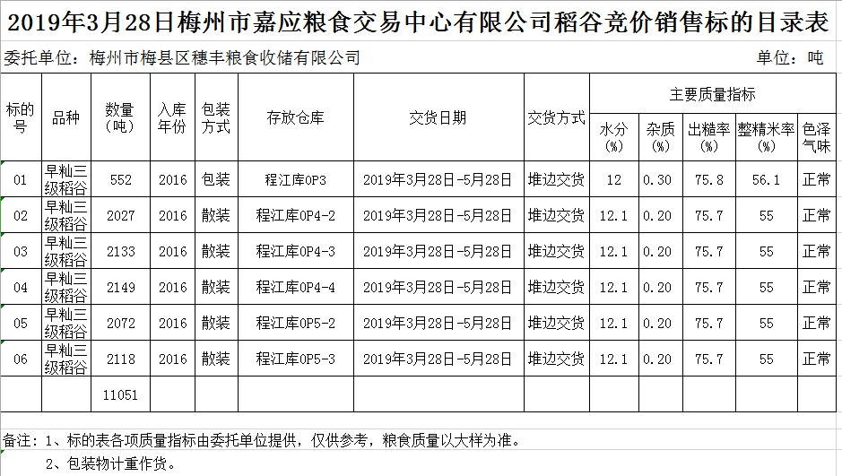 受客戶委托,梅州市嘉應(yīng)糧食交易中心有限公司定于2019年3月28日(星期四)舉辦糧食競價交易會,梅州市梅縣區(qū)穗豐糧食收儲有限公司擬銷售2016年早秈稻11051噸。