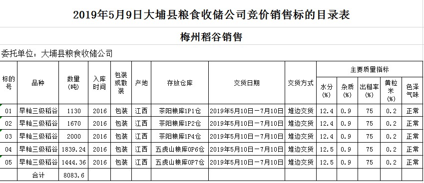 受客戶委托,梅州市嘉應糧食交易中心有限公司定于2019年5月9日(星期四)舉辦糧食競價交易會,大埔縣糧食收儲公司擬銷售2016年早秈稻8083.6噸。