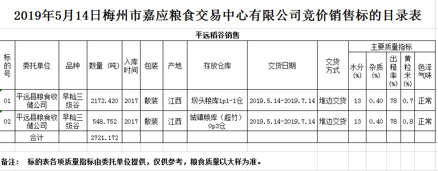 受客戶委托,梅州市嘉應糧食交易中心有限公司定于2019年5月14日(星期二)舉辦糧食競價交易會,平遠縣糧食收儲公司擬銷售2017年早秈稻2721.172噸。