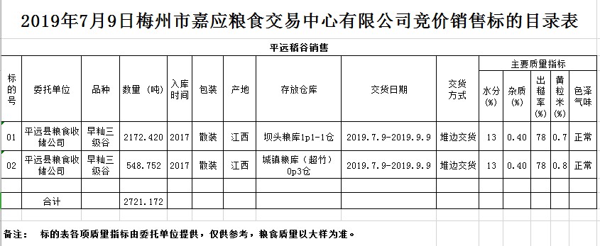 受客戶委托,梅州市嘉應(yīng)糧食交易中心有限公司定于2019年7月9日(星期二)舉辦糧食競價(jià)交易會(huì),平遠(yuǎn)縣糧食收儲(chǔ)公司擬銷售2017年早秈稻2721.172噸。