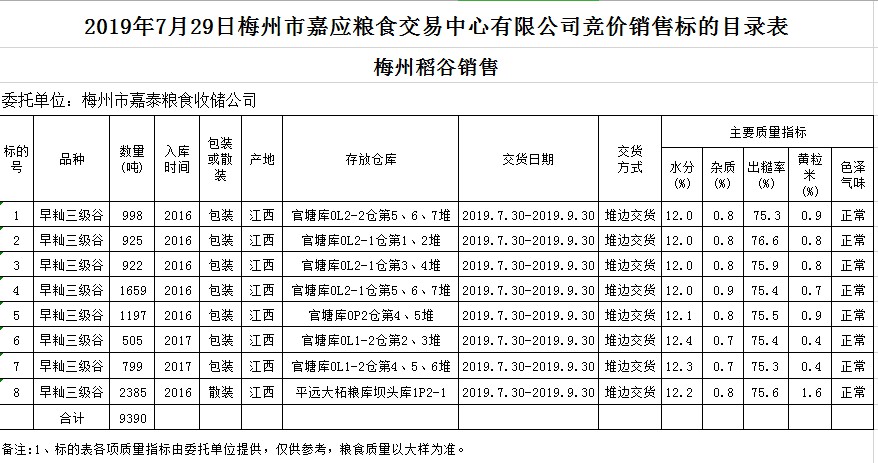 受客戶委托,梅州市嘉應(yīng)糧食交易中心有限公司定于2019年7月29日(星期一)舉辦糧食競(jìng)價(jià)交易會(huì),梅州市嘉泰糧食收儲(chǔ)公司擬銷售2016年、2017年早秈稻9390噸。