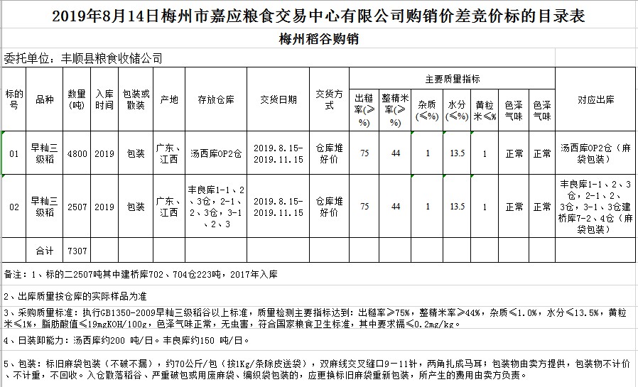 受客戶委托,梅州市嘉應(yīng)糧食交易中心有限公司定于2019年8月14日(星期三)舉辦稻谷購銷價差聯(lián)動標的交易會,豐順縣糧食收儲公司擬銷售和采購早秈稻7307噸。