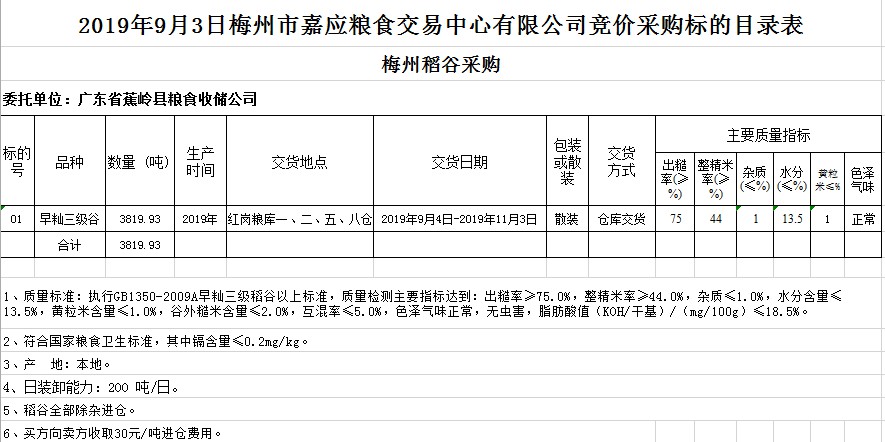 交易時間和地點:2019年9月3日(星期二)上午10時。廣東省梅州市彬芳大道南161號梅州市糧食交易中心3樓。