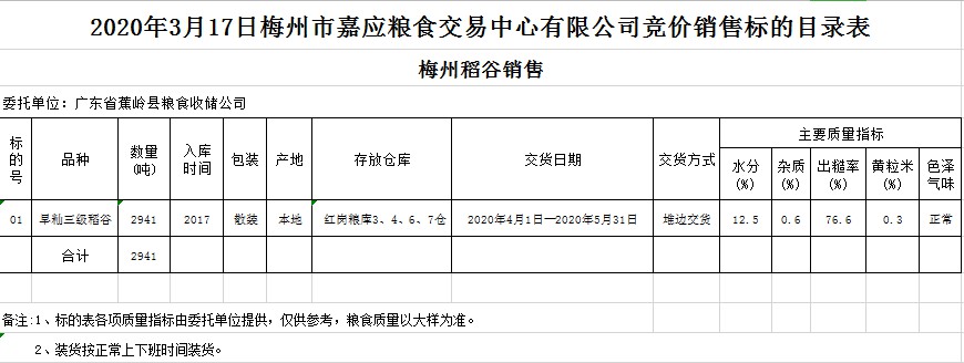 交易時間和地點:2020年3月17日(星期二)上午10時15分。廣東省梅州市彬芳大道南161號梅州市糧食交易中心3樓。