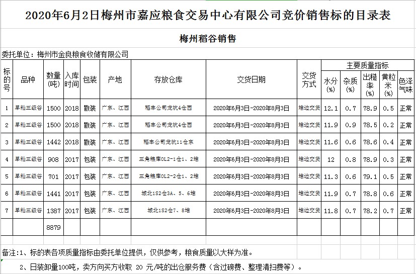 交易時(shí)間和地點(diǎn):2020年6月2日(星期二)上午10時(shí)15分。廣東省梅州市彬芳大道南161號(hào)梅州市糧食交易中心3樓。