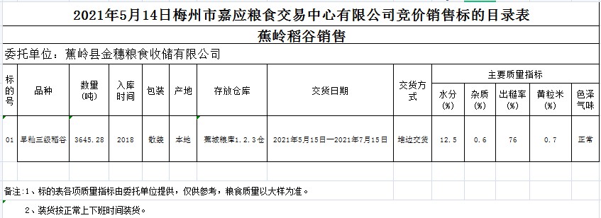 受客戶委托,梅州市嘉應糧食交易中心有限公司定于2021年5月14日(星期五)舉辦糧食競價交易會。蕉嶺縣金穗糧食收儲有限公司擬銷售2018年早秈稻3645.28噸。