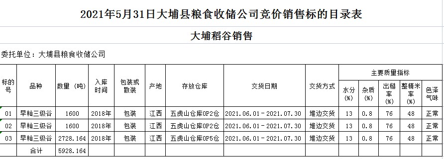 受客戶委托,梅州市嘉應(yīng)糧食交易中心有限公司定于2021年5月31日(星期一)舉辦糧食競價(jià)交易會。大埔縣糧食收儲公司擬銷售2018年早秈稻5928.164噸。