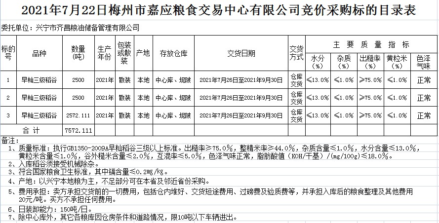受客戶委托,梅州市嘉應糧食交易中心有限公司定于2021年7月22日(星期四)舉辦糧食競價交易會。興寧市齊昌糧油儲備管理有限公司擬采購2021年早秈稻7572.111噸。