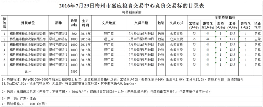 受客戶委托,梅州市嘉應(yīng)糧食交易中心有限公司定于2016年7月29日舉辦糧食競價(jià)交易會(huì),梅州市梅縣區(qū)穗豐糧食收儲(chǔ)有限公司擬采購2016年產(chǎn)早秈三級(jí)稻谷6892噸。