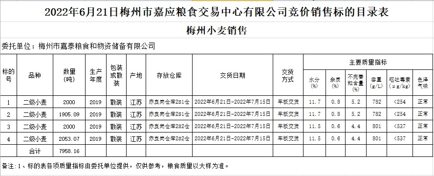 受客戶委托,梅州市嘉應(yīng)糧食交易中心有限公司定于2022年6月21日(星期二)舉辦糧食競價交易會。梅州市嘉泰糧食和物資儲備有限公司擬銷售2019年小麥7958.16噸。