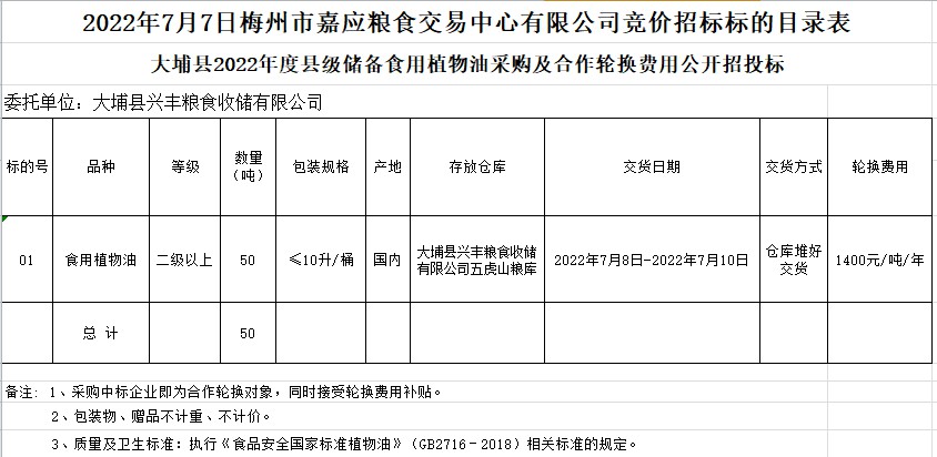 大埔縣2022年度縣級儲備食用植物油采購及合作輪換費用公開招投標公告