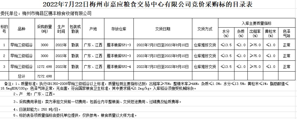 受客戶委托,梅州市嘉應(yīng)糧食交易中心有限公司定于2022年7月22日(星期五)舉辦糧食競價交易會。梅州市梅縣區(qū)穗豐糧食收儲有限公司擬采購2022年早秈稻7272.698噸。