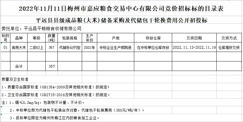受客戶委托,梅州市嘉應(yīng)糧食交易中心有限公司定于2022年11月11日(星期五)上午10時在廣東省梅州市彬芳大道南161號梅州市糧食交易中心3樓,舉辦平遠(yuǎn)縣縣級儲備成品糧采購公開招標(biāo)。