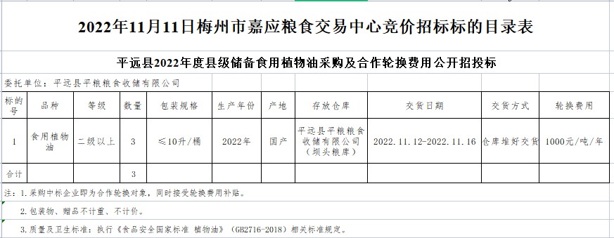 受客戶委托,梅州市嘉應(yīng)糧食交易中心有限公司定于2022年11月11日(星期五)上午10時(shí)05分在廣東省梅州市彬芳大道南161號(hào)梅州市糧食交易中心3樓,舉辦平遠(yuǎn)縣縣級(jí)食用植物油儲(chǔ)備采購及合作輪換費(fèi)公開招標(biāo)。