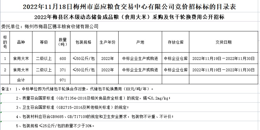 受客戶委托,梅州市嘉應(yīng)糧食交易中心有限公司定于2022年11月18日(星期五)上午10時(shí)在廣東省梅州市彬芳大道南161號(hào)梅州市糧食交易中心3樓,舉辦梅縣區(qū)本級(jí)成品糧動(dòng)態(tài)儲(chǔ)備代儲(chǔ)采購(gòu)及包干輪換公開(kāi)招標(biāo)。
