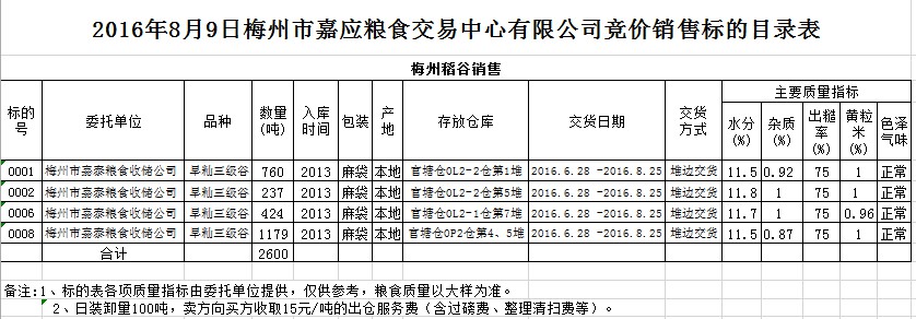 受客戶委托,梅州市嘉應(yīng)糧食交易中心有限公司定于2016年8月9日舉辦糧食競價(jià)交易會,梅州市嘉泰糧食收儲公司擬銷售2013年產(chǎn)早秈三級稻谷2600噸。
