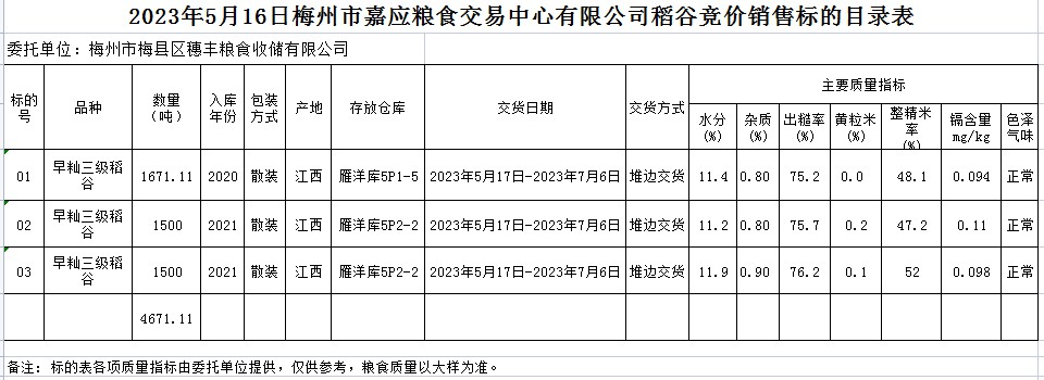 受客戶委托,梅州市嘉應(yīng)糧食交易中心有限公司定于2023年5月16日(星期二)舉辦糧食競價(jià)交易會(huì)。梅州市梅縣區(qū)穗豐糧食收儲(chǔ)有限公司擬銷售2020、2021年早秈稻4671.11噸。