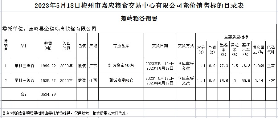 受客戶委托,梅州市嘉應(yīng)糧食交易中心有限公司定于2023年5月18日(星期四)舉辦糧食競(jìng)價(jià)交易會(huì)。蕉嶺縣金穗糧食收儲(chǔ)有限公司擬銷售2020年早秈稻3534.79噸。