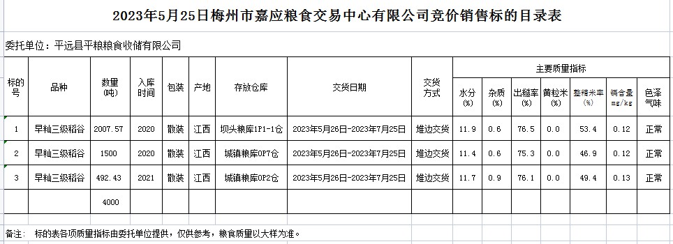 受客戶委托,梅州市嘉應(yīng)糧食交易中心有限公司定于2023年5月25日(星期四)舉辦糧食競價交易會。平遠縣平糧糧食收儲有限公司擬銷售2020年、2021年早秈稻4000噸。