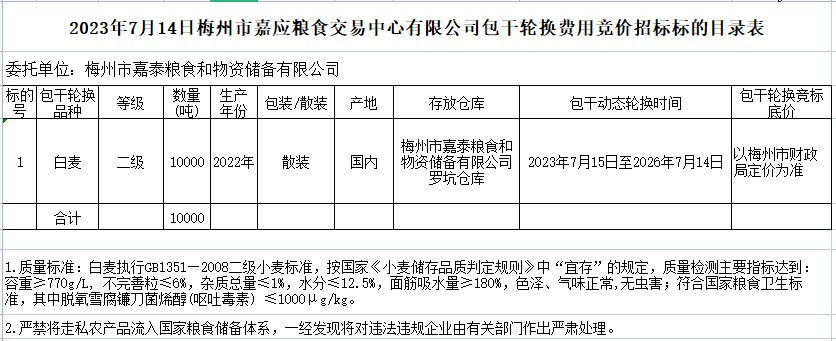 二級小麥10000噸,總價(jià)款32577858.44元。包干輪換期限為3年,即從2023年7月15日至2026年7月14日。