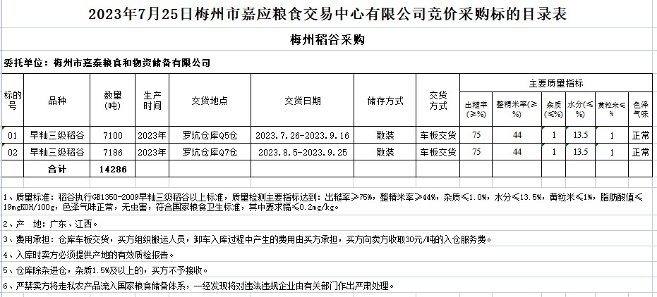 受客戶委托,梅州市嘉應(yīng)糧食交易中心有限公司定于2023年7月25日(星期二)舉辦糧食競價(jià)交易會。梅州市嘉泰糧食和物資儲備有限公司擬采購2023年早秈稻14286噸。
