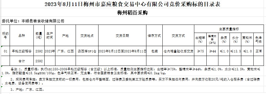 受客戶委托,梅州市嘉應(yīng)糧食交易中心有限公司定于2023年8月11日(星期五)舉辦糧食競價交易會。豐順縣糧食收儲有限公司擬采購2023年早秈稻2592噸。