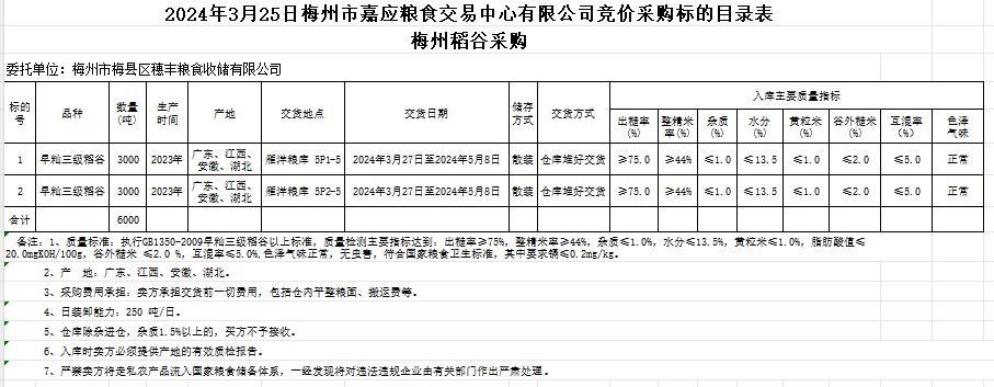 受客戶委托,梅州市嘉應糧食交易中心有限公司定于2024年3月25日(星期一)舉辦糧食競價交易會。梅州市梅縣區(qū)穗豐糧食收儲有限公司擬采購2023年產早秈稻6000噸。