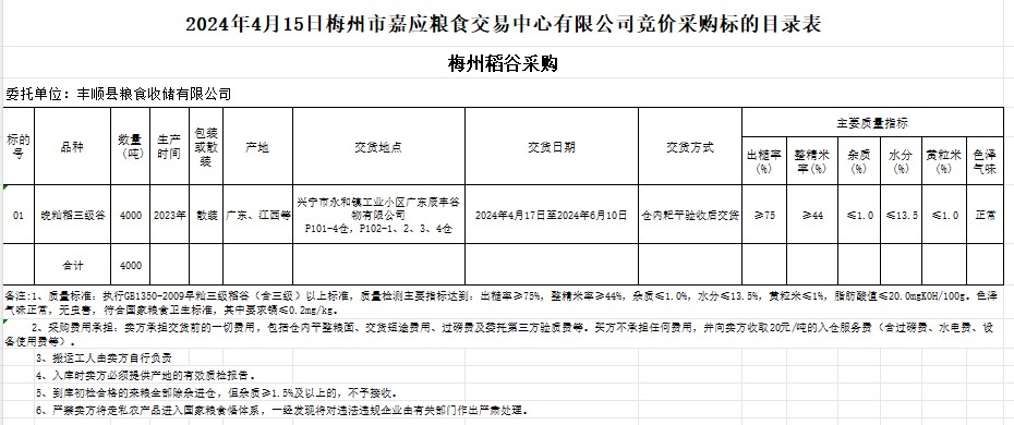 受客戶委托,梅州市嘉應糧食交易中心有限公司定于2024年4月15日(星期一)舉辦糧食競價交易會。豐順縣糧食收儲有限公司擬采購2023年產晚秈稻4000噸。