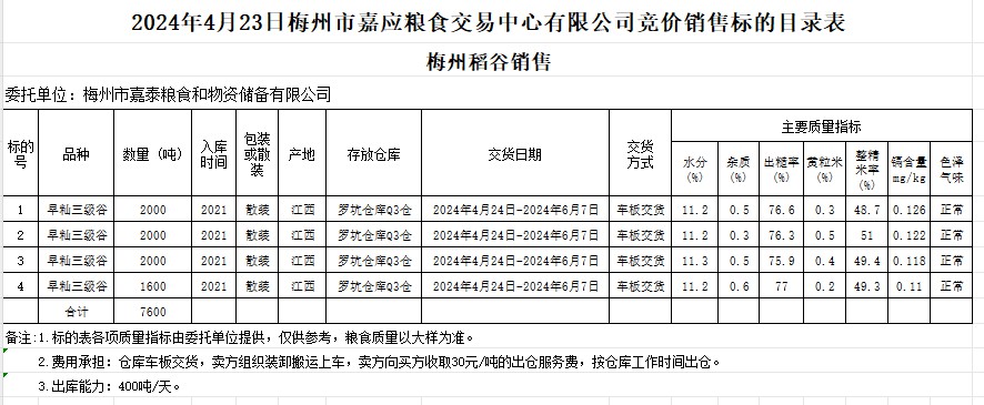 受客戶委托,梅州市嘉應(yīng)糧食交易中心有限公司定于2024年4月23日(星期二)舉辦糧食競價交易會。梅州市嘉泰糧食和物資儲備有限公司擬銷售2021年產(chǎn)早秈稻7600噸。