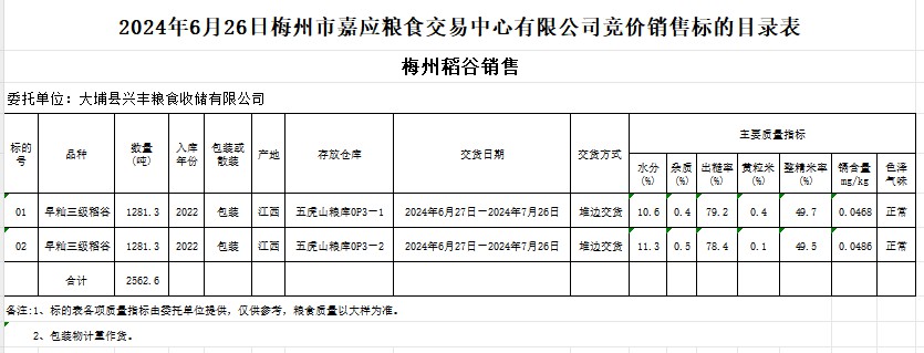 受客戶委托,梅州市嘉應(yīng)糧食交易中心有限公司定于2024年6月26日(星期三)舉辦糧食競價(jià)交易會(huì)。大埔縣興豐糧食收儲(chǔ)有限公司擬銷售2022年產(chǎn)早秈稻谷2562.6噸。