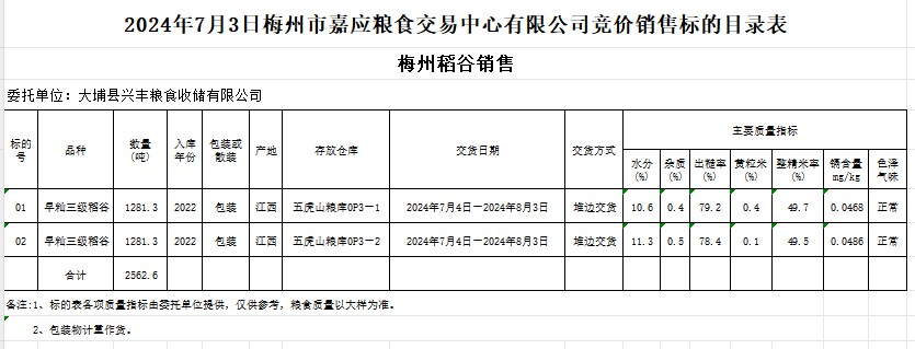 受客戶委托,梅州市嘉應(yīng)糧食交易中心有限公司定于2024年7月3日(星期三)舉辦糧食競價(jià)交易會(huì)。大埔縣興豐糧食收儲(chǔ)有限公司擬銷售2022年產(chǎn)早秈稻谷2562.6噸。