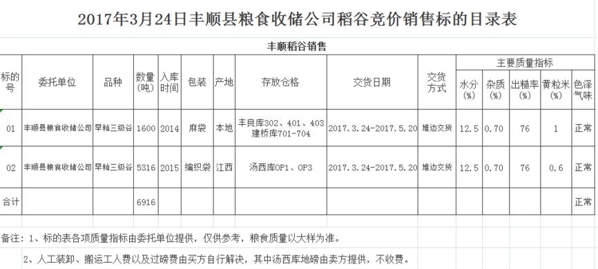 受客戶委托,梅州市嘉應糧食交易中心有限公司定于2017年3月24日舉辦糧食競價交易會,豐順縣糧食收儲公司擬銷售早秈三級稻谷6916噸。