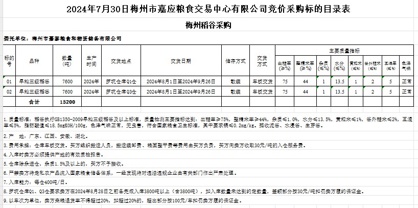 受客戶委托,梅州市嘉應(yīng)糧食交易中心有限公司定于2024年7月30日(星期二)舉辦糧食競價(jià)交易會。梅州市嘉泰糧食和物資儲備有限公司擬采購2024年產(chǎn)早秈稻15200噸。