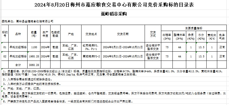受客戶委托,梅州市嘉應糧食交易中心有限公司定于2024年8月20日(星期二)舉辦糧食競價交易會。蕉嶺縣金穗糧食收儲有限公司擬采購2024年產(chǎn)早秈稻3060.28噸。