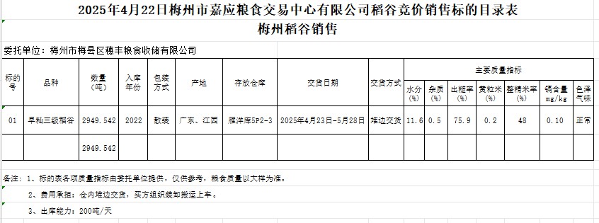 受客戶委托,梅州市嘉應糧食交易中心有限公司定于2025年4月22日(星期二)舉辦糧食競價交易會。梅州市梅縣區(qū)穗豐糧食收儲有限公司擬銷售2022年產早秈稻谷2949.542噸。