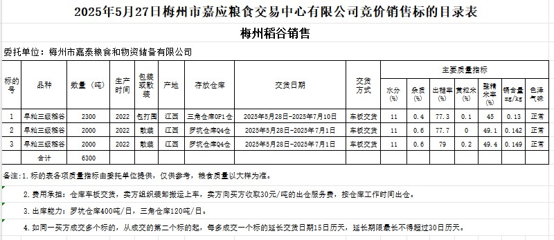 受客戶委托,梅州市嘉應(yīng)糧食交易中心有限公司定于2025年5月27日(星期二)舉辦糧食競(jìng)價(jià)交易會(huì)。梅州市嘉泰糧食和物資儲(chǔ)備有限公司擬銷售2022年產(chǎn)早秈稻谷6300噸。