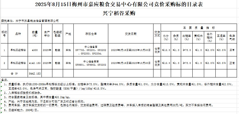 受客戶委托,梅州市嘉應(yīng)糧食交易中心有限公司定于2025年8月15日(星期五)舉辦糧食競價交易會。興寧市齊昌糧油儲備管理有限公司擬采購2025年產(chǎn)早秈稻谷8442.183噸。