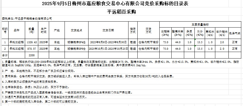 受客戶(hù)委托,梅州市嘉應(yīng)糧食交易中心有限公司定于2025年9月5日(星期五)舉辦糧食競(jìng)價(jià)交易會(huì)。平遠(yuǎn)縣平糧糧食收儲(chǔ)有限公司擬采購(gòu)2025年產(chǎn)早秈稻谷2200噸。