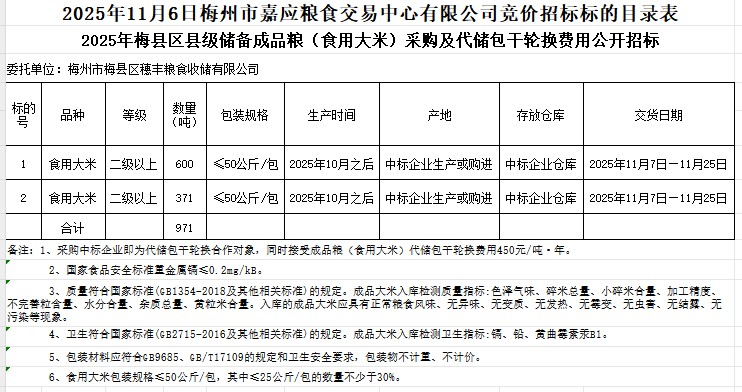 梅縣區(qū)2025年縣級儲備成品糧(食用大米)采購及代儲包干輪換費用公開招標公告