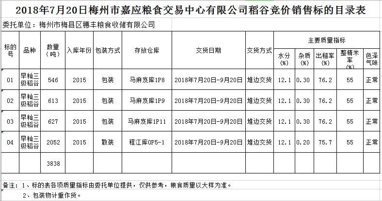 受客戶委托,梅州市嘉應(yīng)糧食交易中心有限公司定于2018年7月20日(星期五)舉辦糧食競價(jià)交易會,梅州市梅縣區(qū)穗豐糧食收儲有限公司擬銷售早秈稻3838噸。