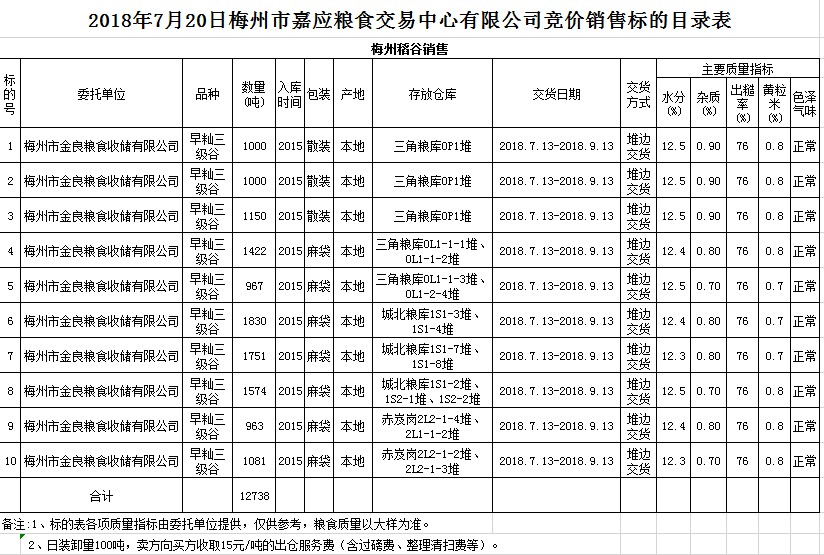 受客戶委托,梅州市嘉應(yīng)糧食交易中心有限公司定于2018年7月20日(星期五)舉辦糧食競(jìng)價(jià)交易會(huì),梅州市金良糧食收儲(chǔ)有限公司擬銷(xiāo)售早秈稻12738噸。