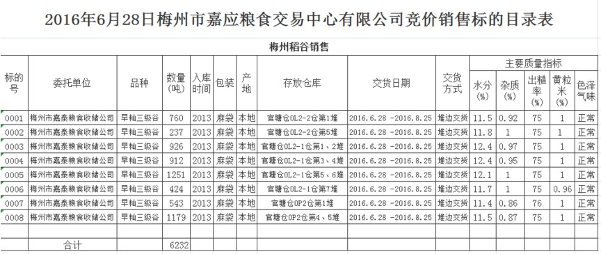 受客戶委托,梅州市嘉應(yīng)糧食交易中心有限公司定于2016年6月28日(星期二)舉辦糧食競價交易會,梅州市嘉泰糧食收儲公司擬銷售官塘倉庫2013年早秈稻谷6232噸。